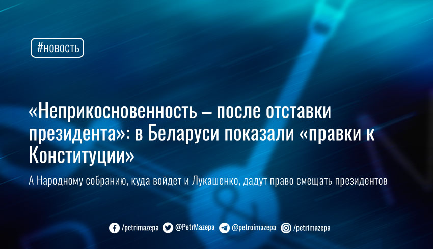 В Беларуси обнародовали «проект изменений в Конституцию» - ими предлагается установить, что президента Беларуси, прекратившего исполнение полномочий, нельзя привлекать к ответственности за действия, совершенные в должности президента. Планируется установить и ряд других ограничений – в частности, дать Всебелорусскому народному собранию право смещать президента с должности.