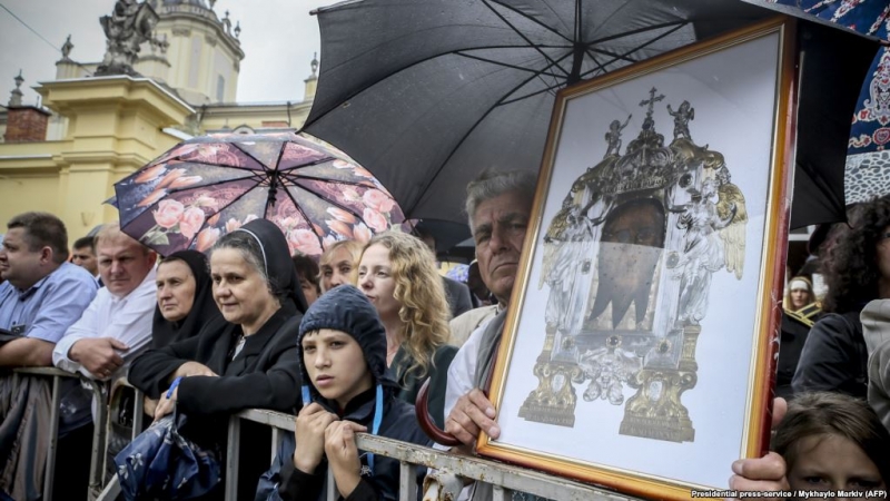 Верующие посещают богослужение во время открытия памятника митрополиту-архиепископу Украинской греко-католической церкви