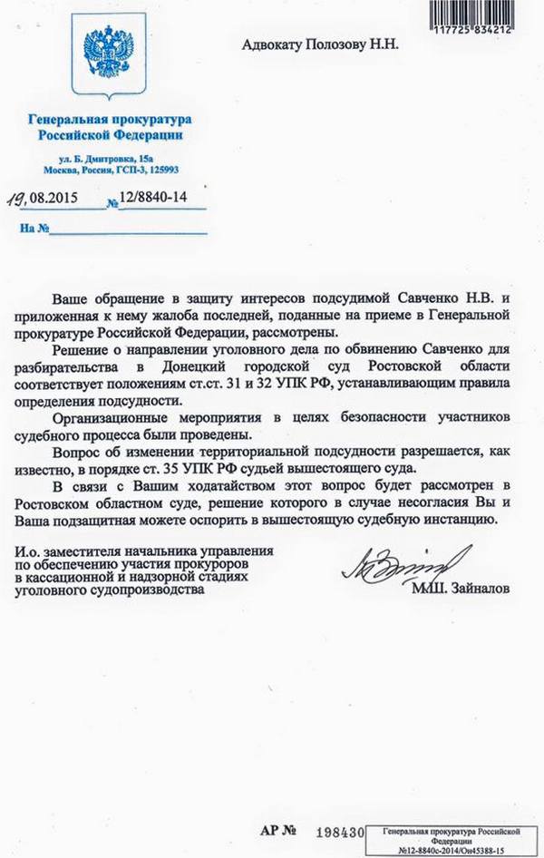 Как вы помните или не помните, защита Надежды Савченко подавала жалобу в связи с тем, что судьбу ее дела будут решать в суде Донецка Ростовской области, а не в Москве. Вот Генпрокуратура РФ накрапала ответ.