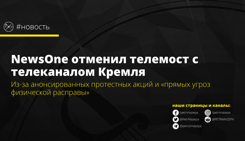Телеканал NewsOne отменил телемост «Надо поговорить» с российским пропагандистским каналом «Россия 24». Свое решение объяснили тем, что журналисты и их семьи получают прямые угрозы физической расправы. Также, в NewsOne, заявили, что причиной отмены стали возможные акции протеста возле их здания.