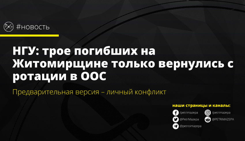 Пресс-служба Национальной гвардии Украины (НГУ) сообщает, что в результате ночной трагедии близь села Новоселица Попельнянского района Житомирской области погибли трое военнослужащих НГУ. Все они находились в отпуске после длительной ротации в ООС.