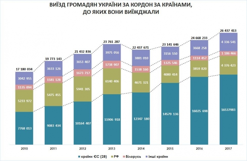 Улавливаете тенденции? Абсолютное большинство наших граждан посещает страны ЕС, а абсолютное большинство любителей северного соседа — попавшие под его жернова жители Донецка, Луганска и благословенного Крыма. Миллионам  украинцев в ЕС уже бесполезно рассказывать про русский мир из телевизора, потому что они лично видели как живут люди в Кракове, в Копенгагене, в Осло, им не расскажешь про пенсии, как в Мурманске, и про стабильность, как в Воронеже.