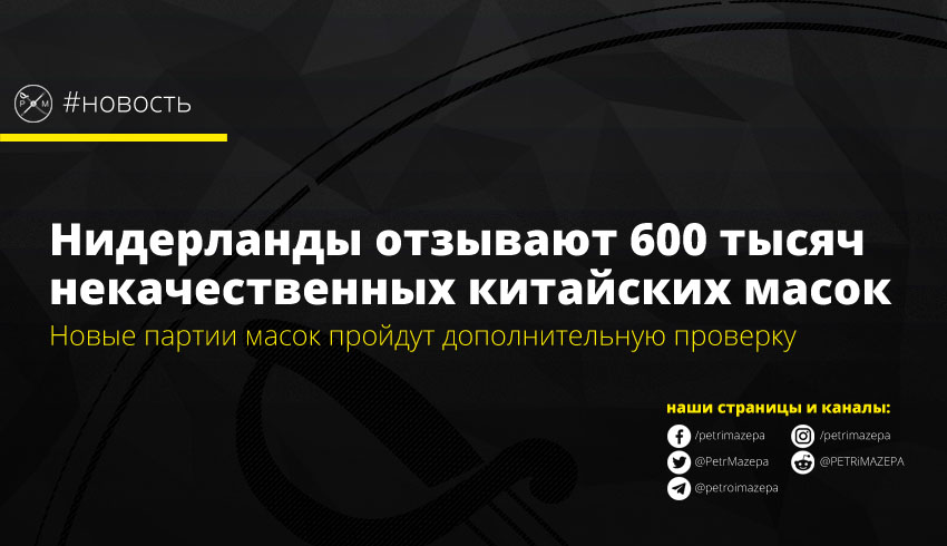 Министерство здравоохранения Нидерландов отозвало партию китайских масок в 600 тысяч штук, из-за низкого качества. Новые партии, которые будут получены из Китая, пройдут дополнительные стандартные испытания.