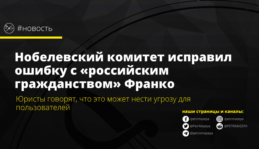 На сайте Нобелевского комитета исправили информацию о гражданстве Ивана Франко, где до вчерашнего дня была указана Российская федерация.