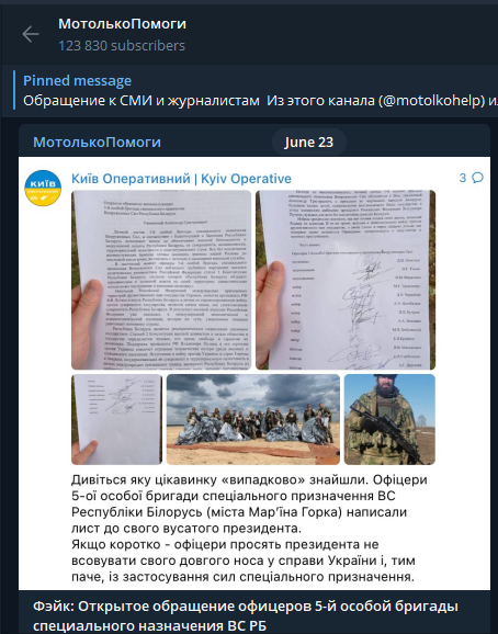 После чего «Беларускі Гаюн» напомнил, что данная информация является второй волной фейка. А его первое пришествие с разоблачением случилось еще 22-23 июня. Тогда Telegram-канал «МотолькоПомоги» опубликовал скрин с «Київ Оперативний», на котором были те же фото письма и похожий текст самого поста.