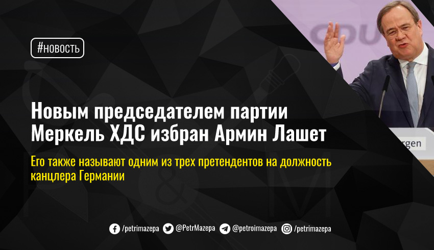 Христианско-демократический союз (ХДС), членом которого является нынешний канцлер Германии Ангела Меркель, на двухдневной онлайн конференции выбрал нового главу – им станет премьер-министр федеральной земли Северный Рейн-Вестфалия Армин Лашет. Также Лашета называют одной из трех наиболее вероятных кандидатур на должность следующего канцлера Германии.
