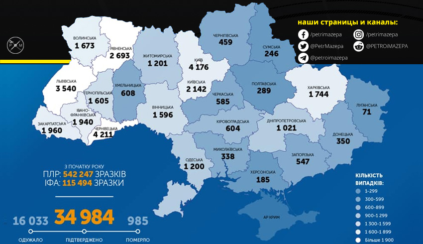 Всего в Украине подтверждено 34984 случая COVID-19, из них 16 033 больных выздоровели (+586 относительно прошлых суток), а 985 умерли (+19). За последние сутки лабораторно подтвержден 921 случай. Всего исследований методом ПЦР в Украине проведено 542247 (+11465), а методом ИФА – 115494 (+7900).
