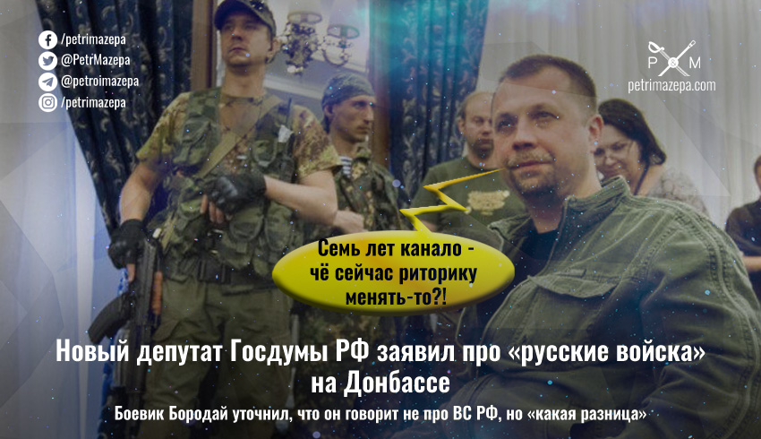 «Я считаю, что это принципиальный момент. И то [на Донбассе] русские войска, и Вооруженные силы РФ — тоже русские войска… Да, одни русские войска называются корпусами народной милиции "ДНР" и "ЛНР", а другие называются просто российской армией. Какая разница?», - заявил Бородай.