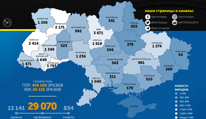 Всего в Украине подтверждено 29070 случаев COVID-19, из них 13141 выздоровел (+372 за последние сутки), 854 умерли (+21). За последние сутки лабораторно подтверждено 689 случаев. Исследовано методом ПЦР 456 509 образцов (+10569) и 60135 образцов - методом ИФА (+8123).