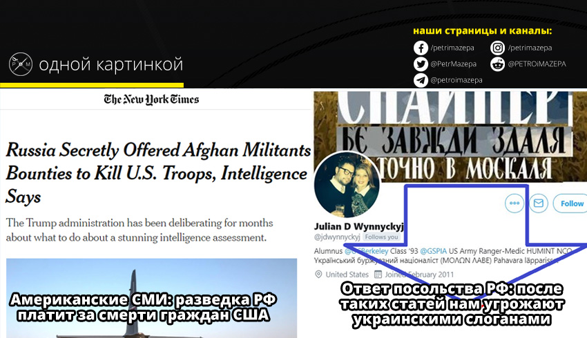 А вот посольство РФ в Вашингтоне уже успело не только окрестить публикацию NYT «фейковыми новостями», но и назвало ее причиной «прямых угроз жизни сотрудников российских посольств в Вашингтоне и Лондоне». Приведя в качестве доказательства обложку одного из твиттер-аккаунтов англоязычного пользователя. На обложке расположена надпись: «Снайпер б’є завжди здаля точно в москаля». Словно для появления этой фразы недостаточно было действий российских ихтамнетов на Донбассе или многочисленных фактов агрессии против Украины в другие исторические периоды.
