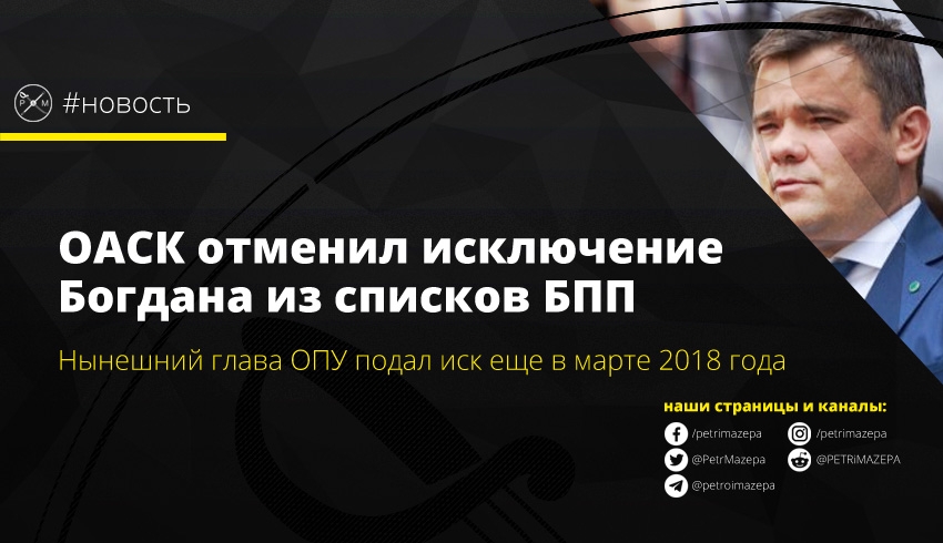 Окружной админсуд Киева (ОАСК) признал незаконным и отменил решение Центризбиркома от 2016 года, которым нынешнего главу ОПУ Андрея Богдана исключили из избирательного списка партии «Блок Петра Порошенко». Соответствующий иск сам Богдан подавал в 2018 году.