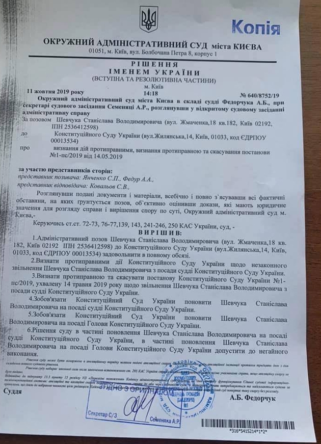 В тексте предоставленной копии решения говорится, что суд «всесторонне и полно» изучил обстоятельства и «объективно оценил доказательства», а потому удовлетворил иск друга Богдана Станислава Шевчука в полном объеме. Также в ОАСК посчитали незаконным увольнение Шевчука, и обязали КСУ восстановить того в должности. И чтобы пылало громче, последним пунктом дали – «допустить немедленное исполнение данного решения». В этом суде первой инстанции продолжают мнить себя копией юридического Олимпа.