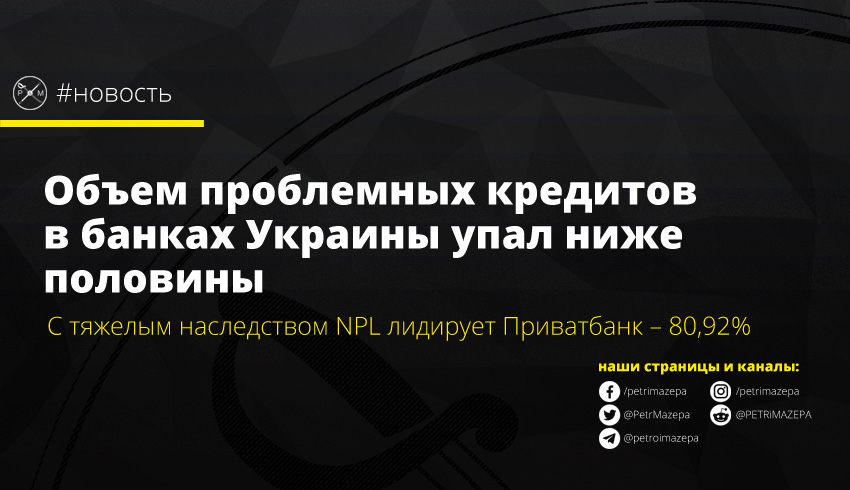 Объем неработающих кредитов (NPL) в украинских банках впервые за последние года сократился ниже уровня 50%. С начала 2019 года доля NPL уменьшилась c 52,9% до 49,3% (или на 3,6%), а за месяц на 0,92%.