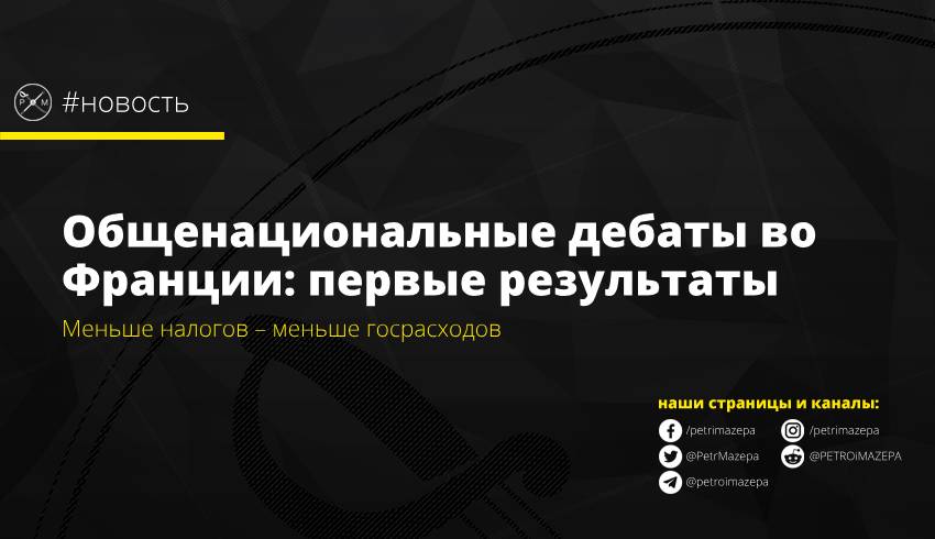 Премьер-министр Франции Эдуар Филипп огласил первые результаты общенациональных дебатов, проведенных по инициативе президента Эммануэля Макрона. Большая часть предложений участников диалога заключается в просьбе снизить налоги — в первую очередь, налог на добавленную стоимость и подоходный налог. В дебатах приняли участие 1,5 млн человек.