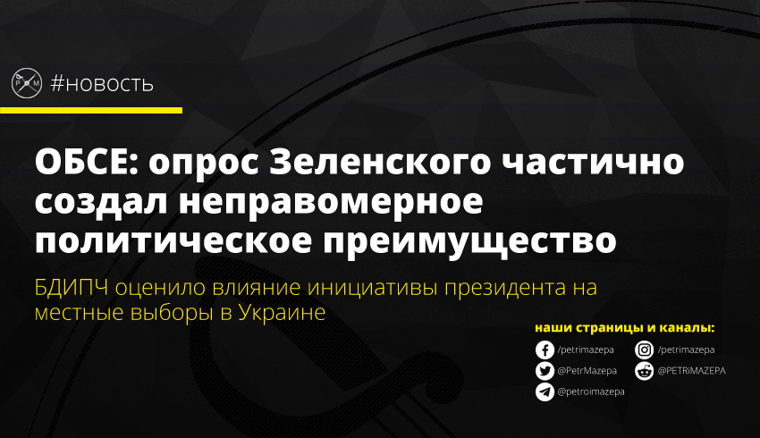 В Бюро ОБСЕ по демократическим институтам и правам человека (БДИПЧ) отметили всеукраинский опрос, инициированный Владимиром Зеленским и проведенный в день выборов, «частично создавал неправомерное политическое преимущество для участников избирательного процесса от партии власти».