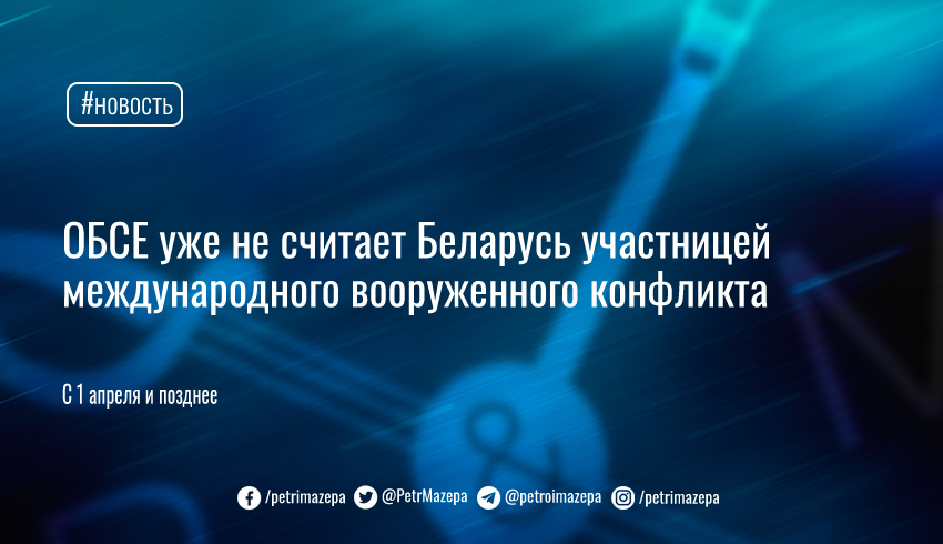 Журналисты из белорусской редакции «Радио Свобода» получили возможность ознакомиться с отчетом Организации по безопасности и сотрудничеству в Европе о войне на Украине, который будет представлен на рассмотрение Постоянного совета ОБСЕ 13 апреля. В докладе утверждается, что с 1 апреля Беларусь уже не является стороной международного вооруженного конфликта.