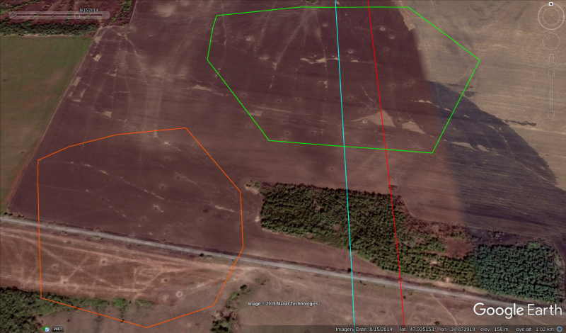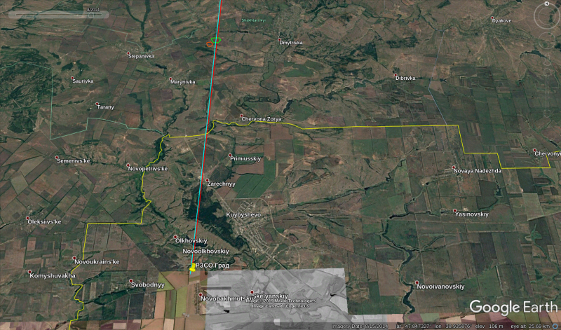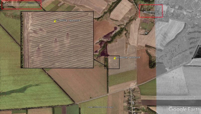 Волонтёры InformNapalm пересмотрели спутниковые снимки сельскохозяйственных полей вокруг хутора Новоольховський в гугл за 2014 год и увидели следы, которые оставили на земле выстрелы из РСЗО БМ-21 «Град».