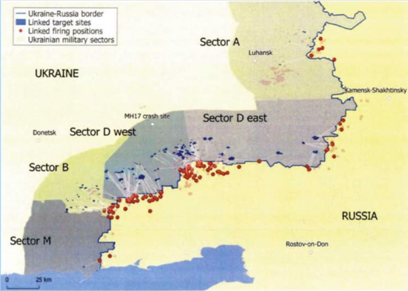 Также обвинение представило расследование группы Bellingcat об артиллерийских ударах с территории РФ по целям на территории Украины. В нем приводятся данные по 136 обстрелам и 133 местам, с которых они проводились. Прокурор сообщил, что нидерландская военная разведка (MIVD) и британский аналитический центр RUSI также подтверждают факты артобстрелов целей в Украине с территории РФ.