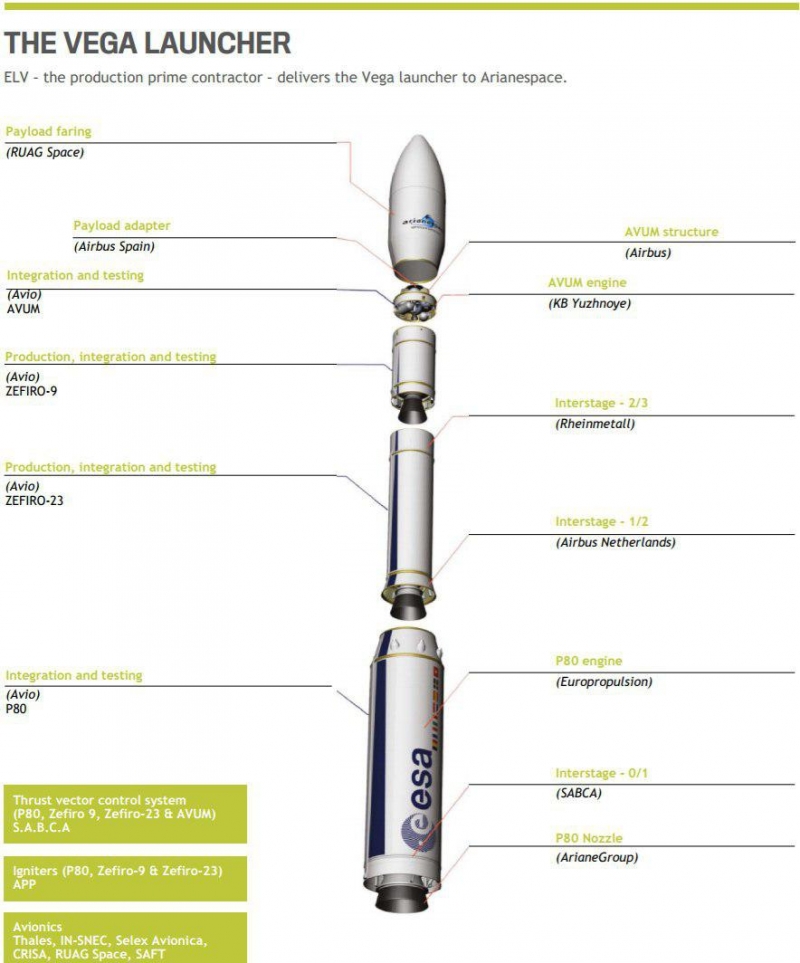 Ракета-носитель лёгкого класса «Вега» создана Итальянским космическим агентством по заказу Европейского космического агентства. Проект развивался с 1998 года, и после его реализации в 2012-м Европа закрыла свои потребности во всех типах носителей, так как к этому моменту уже летала тяжелая ракета «Ариан-5», а в качестве средней была выбрана российская ракета «Союз-СТБ». Двигатель РД-843 к четвёртой ступени этой ракеты производится в Украине на заводе «Южмаш», а разработан он также украинским конструкторским бюро «Южное». Всего было построено 16 двигателей. Начавшаяся в 2014 году война могла подкосить этот международный проект. В Европе даже были начаты работы по созданию двигателя на замену, но сейчас договор на поставку двигателей продлён до 2020 года и предполагает поставку ещё как минимум 20 штук.