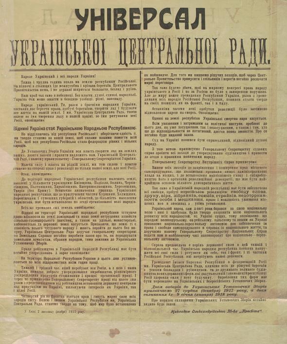Украинская революция выделилась из общероссийской уже 4(17) марта, с появлением Центральной Рады — вначале координационного органа революционных сил, а с апреля — фактического местного предпарламента. В июне Украина провозгласила свою автономию и приступила к строительству государственности.