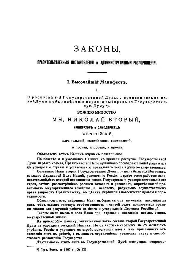 2. Контрреволюция (неполная) 1907 года. 3(16) июня царь не только в очередной раз распустил Думу, на что был уполномочен, но и радикально изменил избирательный закон. Поскольку без одобрения Думы законы менять было нельзя, Николай де-факто произвёл в России государственный переворот (так называемый «третьеиюньский»), узурпировав часть уже не принадлежавшей ему власти. Но самое главное — новая избирательная система резко сокращала право голоса населения (Калмыкия, Средняя Азия и Якутия лишались депутатов полностью, Кавказ и Польша — частично), упраздняла равное и пропорциональное представительство, то есть была контрреволюционной по своей сути. Возвращения к самодержавию, конечно, не случилось, но политические свободы ощутимо сузились. Контрреволюцией её сделали печально знаменитые «столыпинские галстуки».