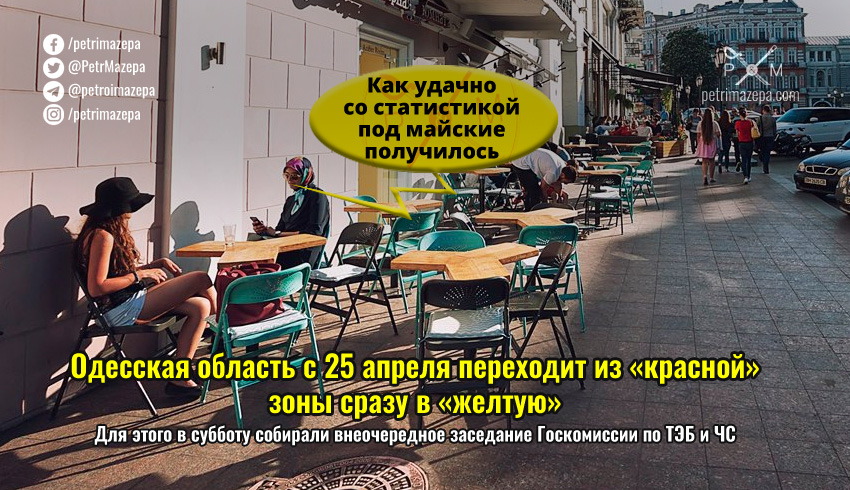 Сегодня, 24 апреля, состоялось внеочередное заседание Государственной комиссии по вопросам техногенно-экологической безопасности и чрезвычайных ситуаций. Как сообщает министр Кабинета министра Олег Немчинов, на нем было решено перевести Одесскую область из «красной» зоны карантинных ограничений сразу в «желтую».