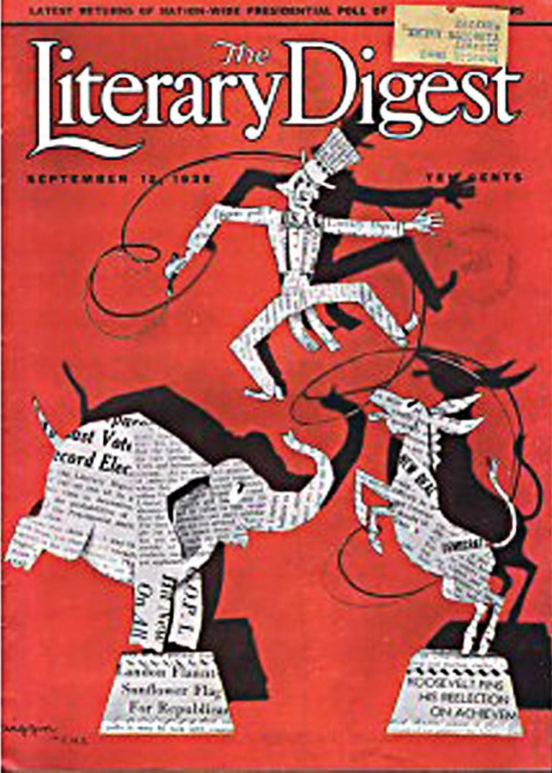 Среди прочих выделялся прогноз журнала The Literary Digest. Основанный в 1890 году, этот журнал представлял собой икону американской политической аналитики того времени — когда телевизоров ещё не было, а солидные мысли солидные люди излагали в солидных толстых периодических изданиях. The Literary Digest и был таковым — толстым журналом, объединившим крупнейшие нью-йоркские политические журналы конца XIX века. Фишкой издания были прогнозы исхода президентских выборов, которые The Literary Digest публиковал с 1916 года — и всегда был прав, уже 5 раз назвав верного кандидата. Методика социологии была проста, но при этом впечатляла. Тираж журнала составлял более одного миллиона экземпляров, кроме того, он рассылал десятки миллионов анкет, в которых просил ответить — за кого получатель намерен голосовать. В итоге накапливалось несколько миллионов ответов, которые аналитики журнала сопоставляли и делали выводы. Вообще, на тот момент так делали большинство аналитиков — только что опросы журнала поражали размерами своей выборки (если вкратце, то эта система была похожа на те голосования, которые устраивает Шрайк — только если представить, что у Шрайка бы голосовал ВЕСЬ украинский сегмент ФБ, ну или все, кто интересуется политикой). К выборам-1936 года The Literary Digest разослал более 10 млн анкет, на 2,4 млн из которых он получил ответ. Результат был следующий — Лэндон на выборах победит в большинстве штатов Севера и Запада, причём наберёт около 57% голосов избирателей и 370 голосов выборщиков, что более чем достаточно для победы на выборах. Выводы журнала вроде бы подтверждали выборы губернатора штата Мэн — есть в США такое политическое поверье, что в Мэне обычно к власти приходит та партия, которой предстоит доминировать и в стране в целом – а на выборах-1936 губернатором Мэна стал республиканец Барро.