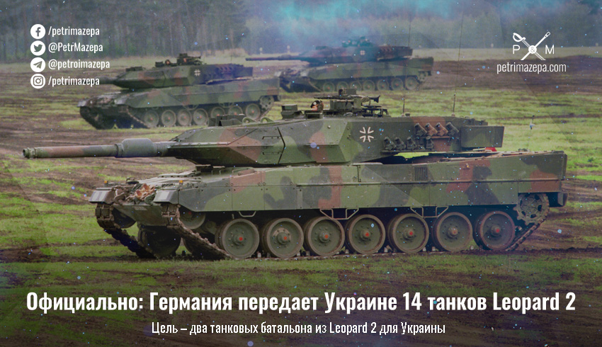 Германия официально заявила о начале передачи Украине танков Leopard 2 — в качестве первого шага нам передадут 14 машин, а в дальнейшем целью является быстрое формирование для Украины двух танковых батальонов с танками Leopard 2.