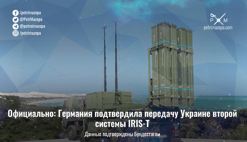 Федеральное правительство Германии подтвердило передачу Украине второй системы ПВО IRIS-T. Данные о предоставлении нам именно двух систем IRIS-T обнародованы на официальном сайте Бундестага.