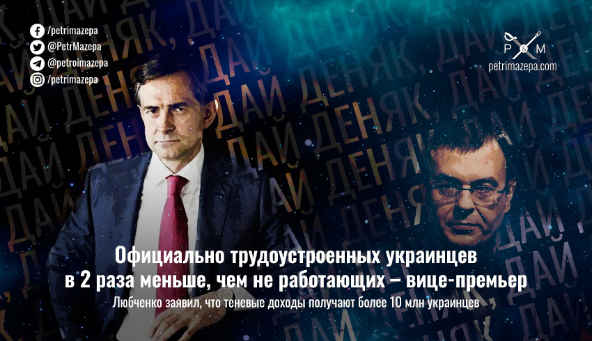 «В прошлом году по данным реестра физических лиц – налогоплательщиков, 11,3 миллиона граждан Украины получили официальную заработную плату. Почти 11 не получили совсем никакого дохода. Плюс имеем более 11 миллионов пенсионеров, размер пенсии которых зависит от легально работающих граждан. То есть имеем за счет одного официально работающего содержание двух неработающих. И все эти категории граждан в одинаковой мере пользуются общественными благами, медицинской помощью, образованием, инфраструктурой, субсидиями, льготами. К слову, теневой фонд оплаты труда оценивается около полутриллиона гривен. В год», - сообщил Любченко во время выступления на форуме «Украина 30».