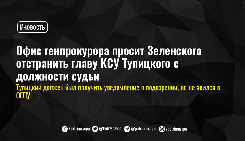 Сегодня глава КСУ Тупицкий должен был прийти в Офис генпрокурора для получения подозрения в подкупе свидетеля и введения в заблуждение суда путем заведомо ложного показания свидетеля. Однако в ОГПУ он так и не явился, сообщив что «не может прибыть по семейным обстоятельствам, однако не предоставил документы об уважительности причин неявки». Из-за этого сообщение о подозрении направили ему по почте.