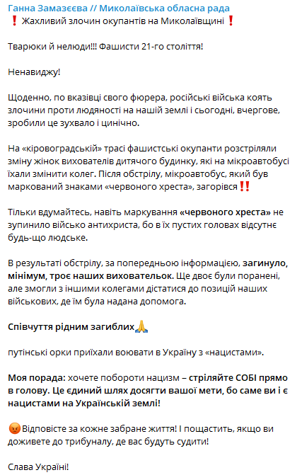 Даже маркировка «красного креста» не остановила врага, информирует глава облсовета. После обстрела автобус загорелся, как минимум три воспитательницы погибли, еще две были ранены, но смогли добраться до позиций украинских военных, где им была предоставлена помощь.