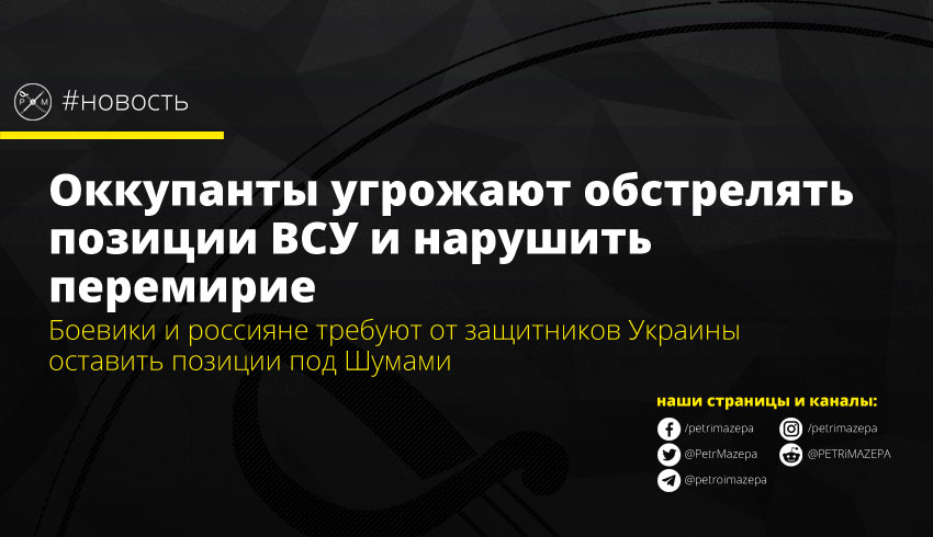 «В заявлении, размещенном на одном из сайтов боевиков гибридной армии РФ, сказано, что они намерены обстрелять позиции Вооруженных сил Украины, потому что Украина якобы "строит траншеи" и это срывает перемирие. Позиции находятся у поселка Шумы Донецкой области. Террористы требуют от ВСУ бросить позиции и уйти», - сообщает Liga.net. Пресс-служба штаба ООС сообщила изданию, что они не комментируют информацию боевиков.
