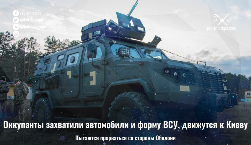 Оккупанты переоделись в форму ВСУ и захватили два автомобиля Вооруженных сил Украины – они на большой скорости движутся к Киеву со стороны Оболони.