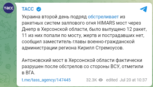 Оккупанты Херсонщины заявили, что Антоновский мост будет временно закрыт для грузового транспорта — по нему разрешено будет ездить только легковым и пассажирским автомобилям. При этом они же заявляют, что мост «фактически разрушен» и даже «может рухнуть», если по нему снова будут стрелять.