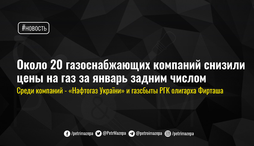 Ряд газоснабжающих компаний задним числом изменила цены для населения за использованный в январе газ. По законодательству компании обязаны сообщать цену на газ не позднее, чем за 5 дней до начала месяца. Но теперь около 20 компаний задним числом изменили цены от 7-10 грн/кубометр до принятой в конце января планки в 6,99 грн/кубометр.