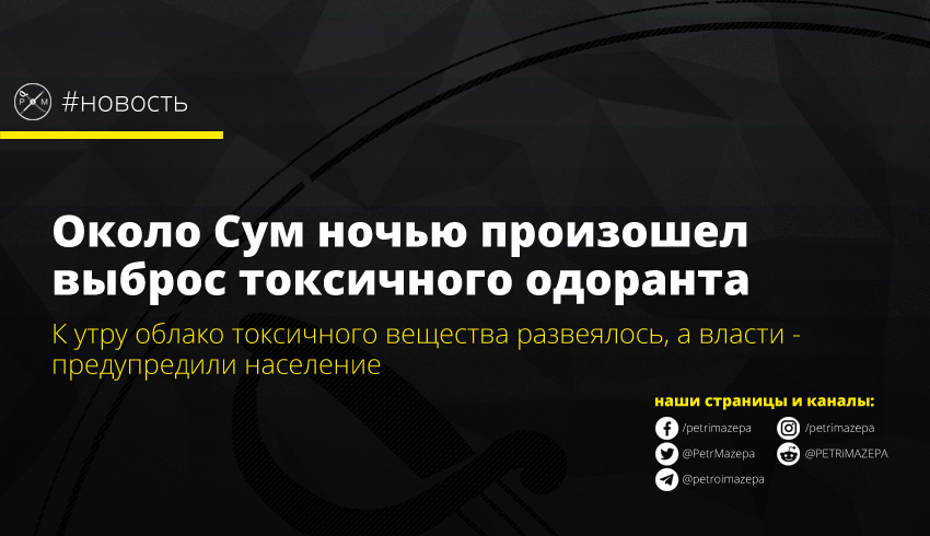 В ночь с воскресенья на понедельник около Сум произошел выброс токсичного одоранта. Это вещество имеет неприятный сильный запах и его используют в качестве добавки к природному газу. Утром городские службы отчитались, что ситуация уже пришла в норму.