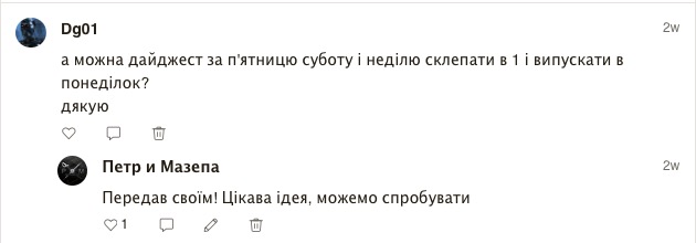 Сегодня завершилось голосование, инициированное по предложению подписчика «Петра и Мазепы» на Patreon. Итак, теперь официально: в субботу дайджестов больше не будет. Таково решение онлайн-редколлегии, с которым мы, в принципе, согласны.