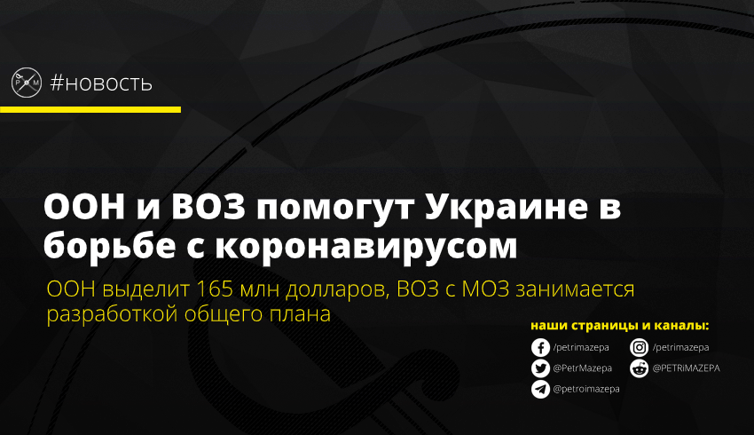 Отмечается, что ООН планирует мобилизовать 165 миллионов долларов, 84 из которых будут направлены на первоочередные нужды системы здравоохранения, оставшиеся 81 миллионов будут направлены на преодоление социально-экономических последствий пандемии. ВОЗ же совместно с Министерством здравоохранения сейчас работает над разработкой Стратегического плана реагирования на пандемию COVID-19 в Украине.