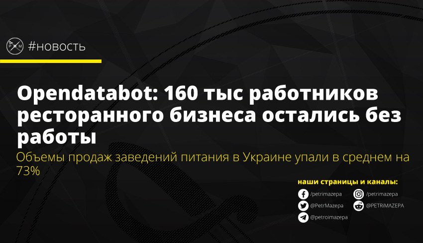 На фоне происходящего, более 160-ти тысяч работников ресторанного бизнеса остались без работы. «Только у клиентов Poster сейчас не работает 13 тысяч сотрудников», — значится в сообщении Opendatabot. К тому же по сравнению с докарантинным периодом, объемы продаж заведений питания в Украине упали в среднем на 73%. При этом продажи в столице упали на 78%, во Львове показатель просел в среднем на 78%, в Харькове — на 73%, в Днепре — на 65%, в Одессе — на 60%.