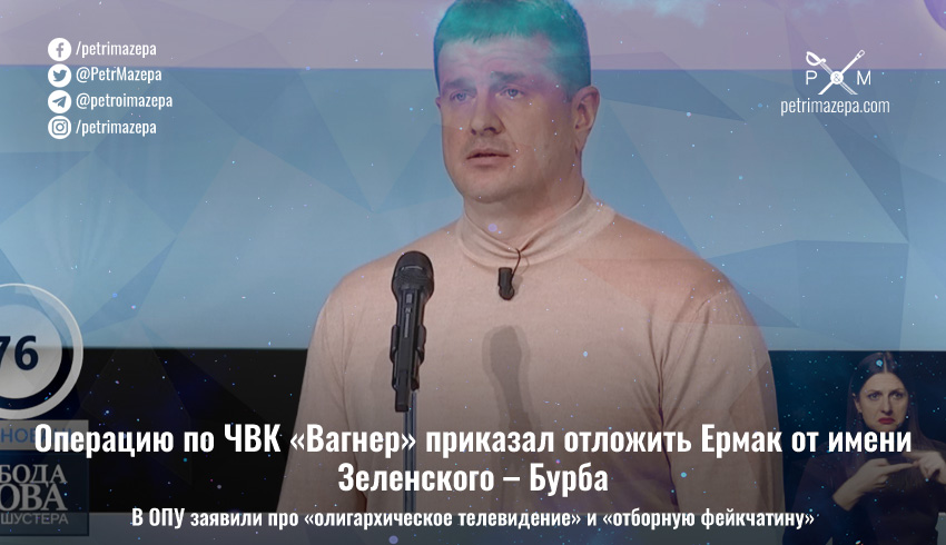 Бывший глава Главного управления разведки Минобороны Василий Бурба в эфире «Свободы слова Савика Шустера» заявил, что приказание перенести спецоперацию по захвату боевиков ЧВК «Вагнер» в Беларуси было передано ему как указание президента Владимира Зеленского, озвученное главой ОПУ Андреем Ермаком. В ОПУ прокомментировали это заявление – и в официальном ответе заявили про «большое нет», «отборную фейкчатину» и «олигархическое телевидение», но не дали опровержения словам Бурбы.
