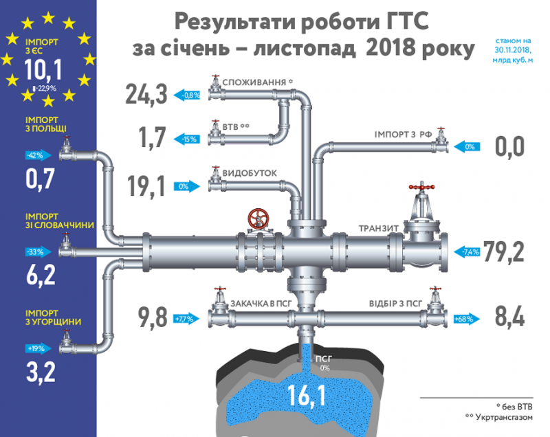 С января по ноябрь 2018 поступления природного газа в ГТС от газодобывающих предприятий Украины составляли 19,1 млрд куб м, что почти равно показателю добычи января - ноября 2017.