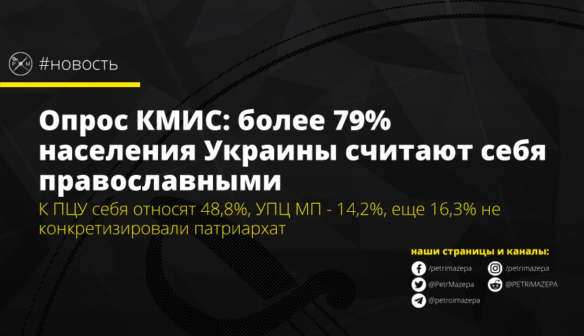 Согласно результатам опроса, к Православной церкви Украины (ПЦУ) себя относит 48,8% населения страны, а 16,3% к православной церкви, но без конкретизации патриархата. В то же время, 14,2% опрошенных относят себя к Украинской православной церкви Московского патриархата (УПЦ МП), а к Украинской греко-католической церкви - 8,8% респондентов, еще 4,9% выбрали другие конфессии, а 2,7% затруднились или отказались отвечать, сообщается на сайте КМИС. Атеистами себя считают 4,3% опрошенных.