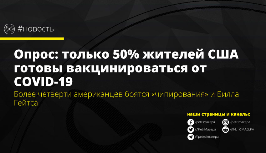 Только 50% американцев готовы вакцинироваться от коронавируса Sars-nCov-2, и почти четверть точно заявили, что вакцинироваться не намерены. Об свидетельствуют результаты опроса Yahoo News / YouGov. При этом 28% взрослых жителей США считают, что миллиардер Билл Гейтс готов использовать кампанию массовой вакцинации для внедрения микрочипов миллиардам людей и их отслеживания.
