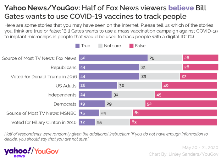 Опрос, который проводился 20 и 21 мая, показал, что 44% республиканцев, и 50% зрителей Fox News верят в теорию заговора с чипированием. Лишь 26% республиканцев и столько же зрителей Fox News правильно идентифицируют информацию как ложную. Меньше всего верящих в эту теорию – среди избирателей Хиллари Клинтон в 2016 году, зрителей MSNBC и демократов (меньше 20%).