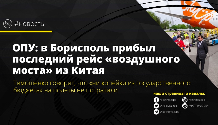 В Международный аэропорт «Борисполь» прибыл самолет из Китая, который доставил 400 тысяч респираторов и 50 тысяч защитных щитков для украинских врачей. Этот рейс стал последним, который выполняется в рамках «воздушного моста», организованного Офисом президента Украины. Теперь бизнес и Минздрав будут самостоятельно пытаться организовывать такие полеты.