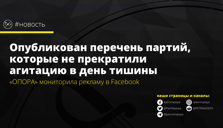 Сеть «ОПОРА» провела мониторинг политической рекламы в Facebook 24 и 25 октября, чтобы зафиксировать – кто из кандидатов и партий нарушает законодательство. В большинстве случаев нарушения были от вовремя незавершенных рекламных акций, но некоторые кандидаты сознательно начинали ротацию своих рекламных постов в день тишины.