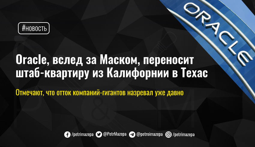 Один из крупнейших мировых производитель программного обеспечения, корпорация Oracle, решила перенести свою штаб-квартиру из Калифорнии в Техас. Причины такого решения комбинированные: уход от высоких налогов и проблем с дорожным траффиком в Калифорнии, а также – глобальный тренд на децентрализацию и удаленную работу, заданный пандемией коронавируса.