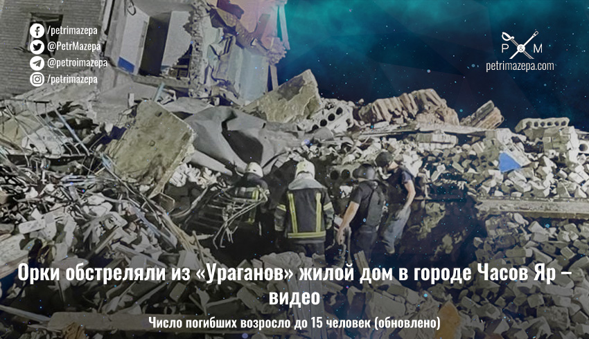 Российские оккупационные войска обстреляли из «Ураганов» жилой дом в городе Часов Яр в Донецкой области. Под завалами пятиэтажного дома оказались более трех десятков человек. Число погибших возросло до десяти.