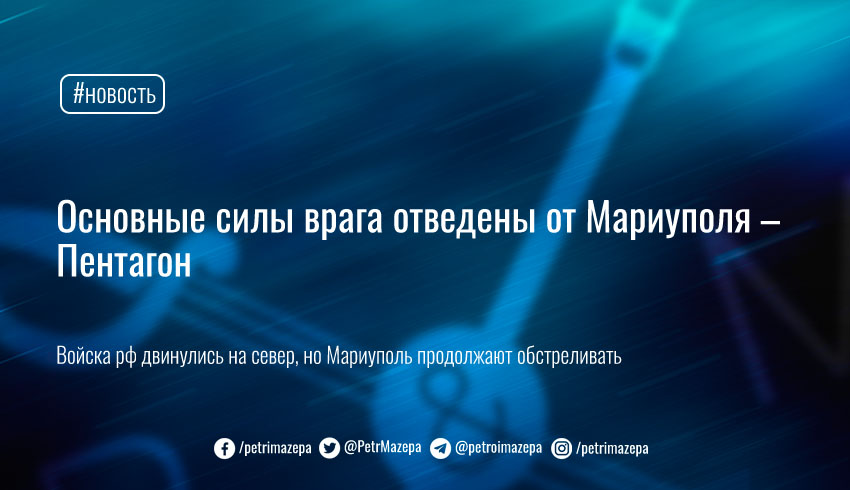 «В основном мы можем признать, что большинство российских сил, наземных сил, которые были направлены на Мариуполь, отошли и двинулись в северном направлении от Мариуполя. Небольшое количество, приблизительно равное паре батальонно-тактических групп, все еще находятся внутри и вокруг Мариуполя», — рассказал спикер Пентагона Джон Кирби на брифинге.